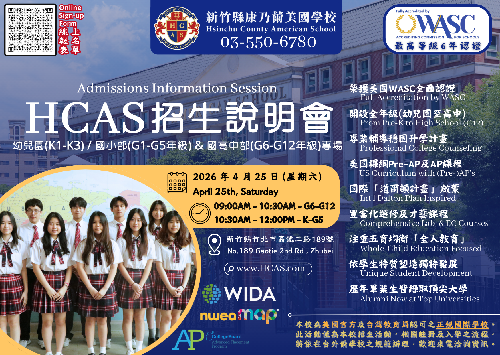 HCAS is an independent, college preparatory, co-educational, US curriculum, day school in Zhubei City, Taiwan for Pre-K through grade 12 on one campus.