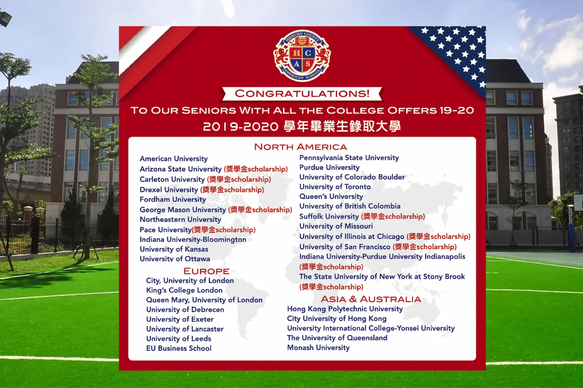 HCAS understands the key role that we play in our students’ academic development, and we continue to evolve in our college counseling program to ensure that our graduates continue to study at the finest higher educational institutions around the world!