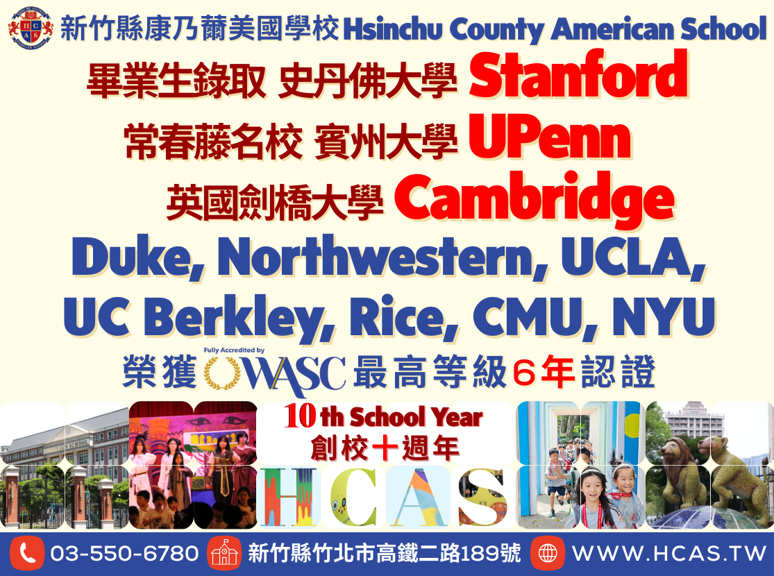 HCAS is an independent, college preparatory, co-educational, US curriculum, day school in Zhubei City, Taiwan for Pre-K through grade 12 on one campus.